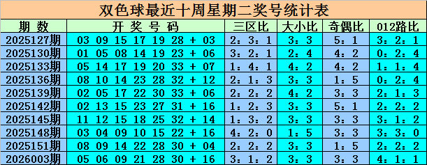 三区间分布分析:上周二第26003期奖号为:05、06、09、21、28、30+16,区间比为3:1:2。本期热区关注红一区,关注区间比:3:1:2。