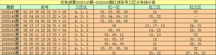 双色球第2026005期奖号为:01 20 22 27 30 33 + 10,红球三区比为1:2:3。