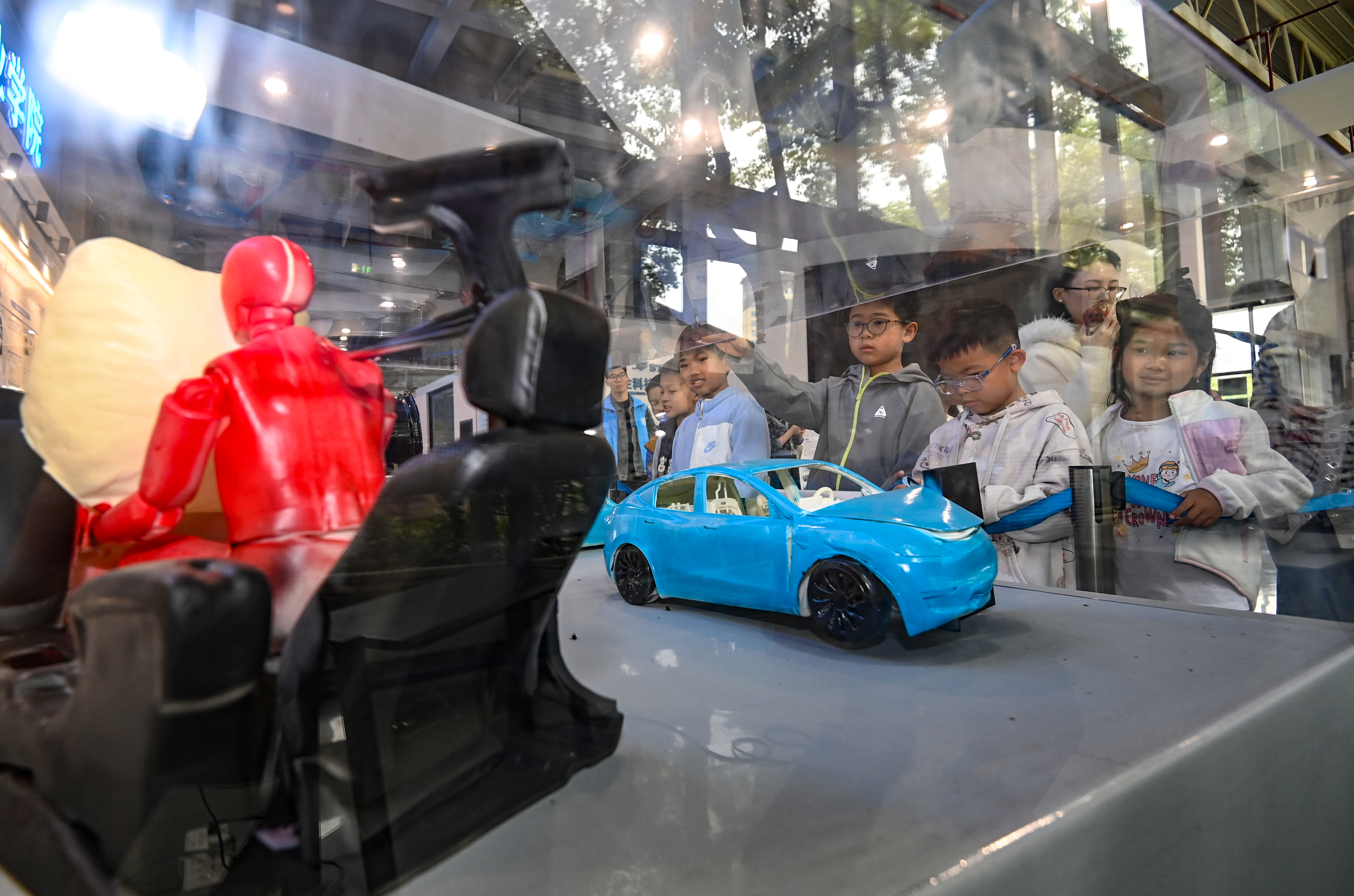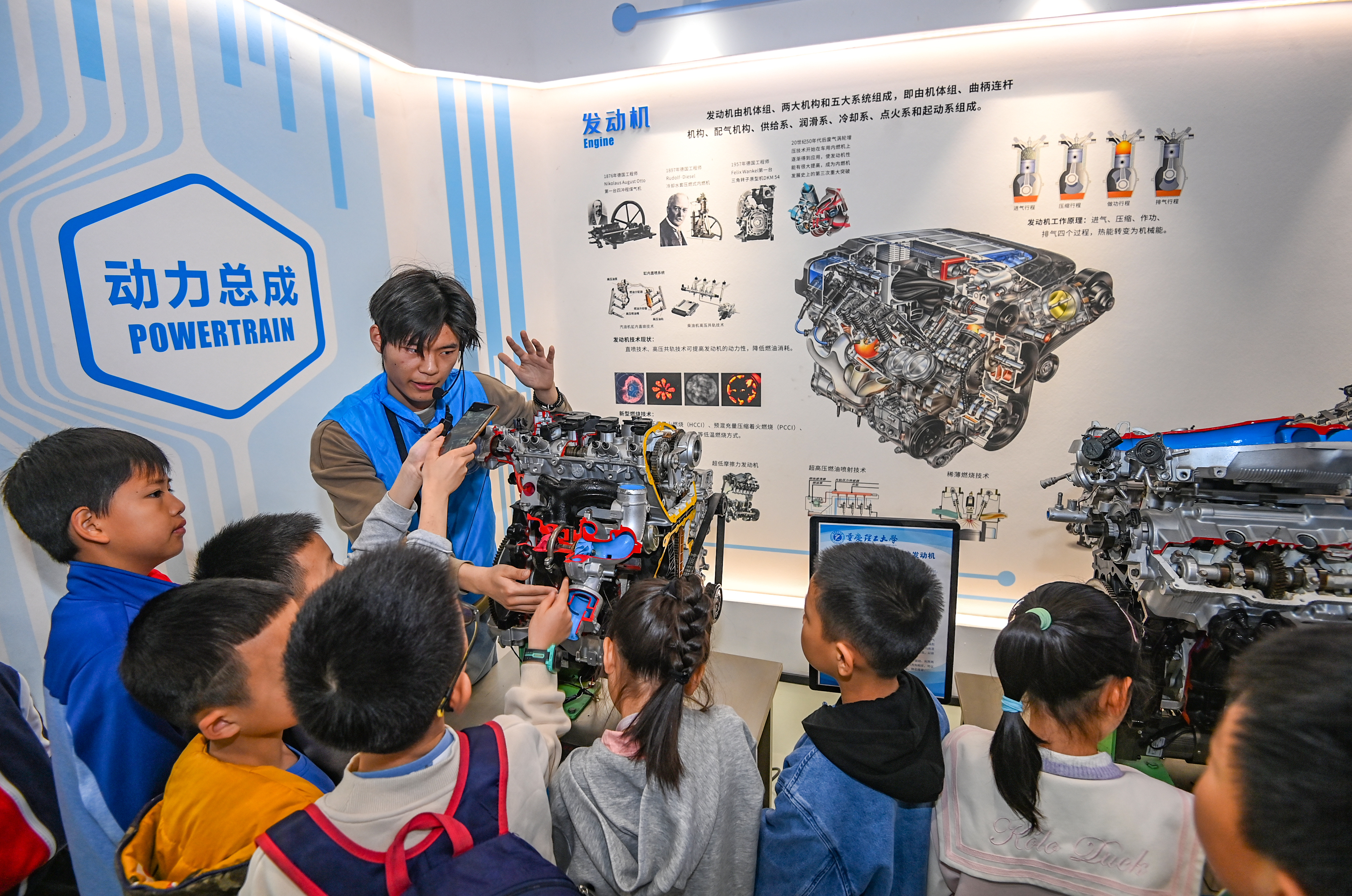 新能源汽车模型、智能驾驶交互设备、汽车核心零部件拆解展示……教育部“场馆育人”项目——重庆理工大学汽车科技馆则让孩子们目不暇接,志愿者们还生动地讲解了汽车运行的科学原理,将传统燃油车到新能源汽车的迭代升级、机械制造到智能网联的技术突破等知识,转化为看得见、摸得着的趣味体验。