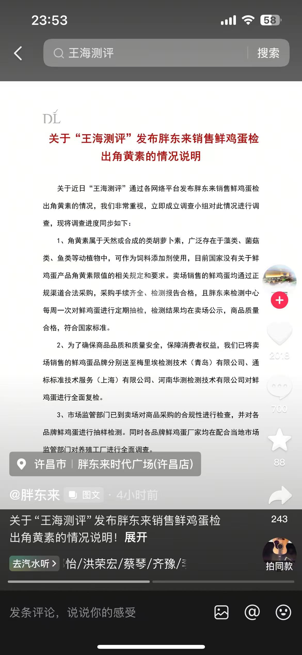 胖东来始终将食品安全放在首位,为顾客提供安全、实用、实在的商品,保障消费者合法权益。“王海测评”以饲料添加剂的标准《饲料添加剂安全使用规范》用来判定鲜鸡蛋角黄素“超标”,属于混淆饲料标准与食品标准,适用标准错误,缺乏法律依据,已给社会公众造成误导,同时也对鲜鸡蛋市场的正常秩序产生不良影响。目前市场监管部门的相关调查以及第三方复检还未出结果,如果最终的调查结果显示鲜鸡蛋存在问题,我们会第一时间公示结果,并立即启动下架召回程序,依法承担相应法律责任,保障每一位顾客的消费权益和消费安全,如果没有问题,我们也将坚决依法诉讼维权,追究此次事件中个人、自媒体、平台的法律责任。